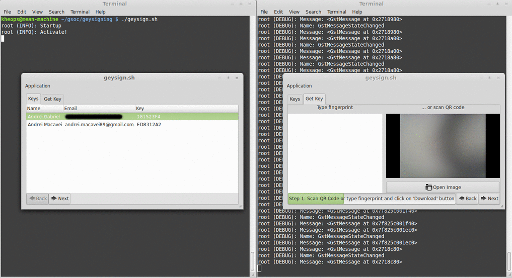 Here is a short demo that shows the process of signing a key by using two Geysign applications on the same machine (unfortunately I didn't had a working network with two computers).